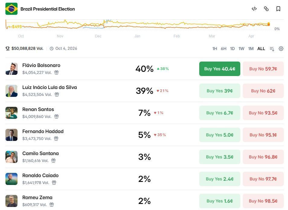 Durante a tarde, Flávio aparecia com 40% de probabilidade de se tornar o próximo presidente do Brasil, enquanto Lula tinha 39%. Ao longo do dia, os percentuais oscilaram, mas o senador se manteve à frente pela primeira vez desde o início das negociações do contrato na plataforma.