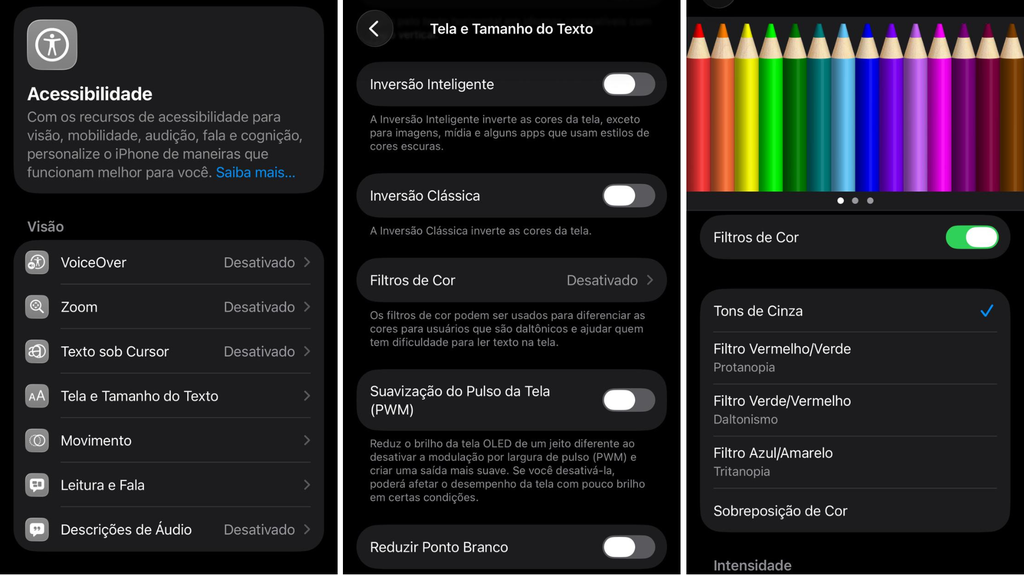 Remover as cores da tela pode deixar o iPhone menos estimulante, o que ajuda a reduzir o tempo de uso de forma natural. Em "ajustes", "acessibilidade", "tela e tamanho do texto" e "filtros de cor", selecione "escala de cinza", tornando toda a navegação menos colorida e mais sóbria.