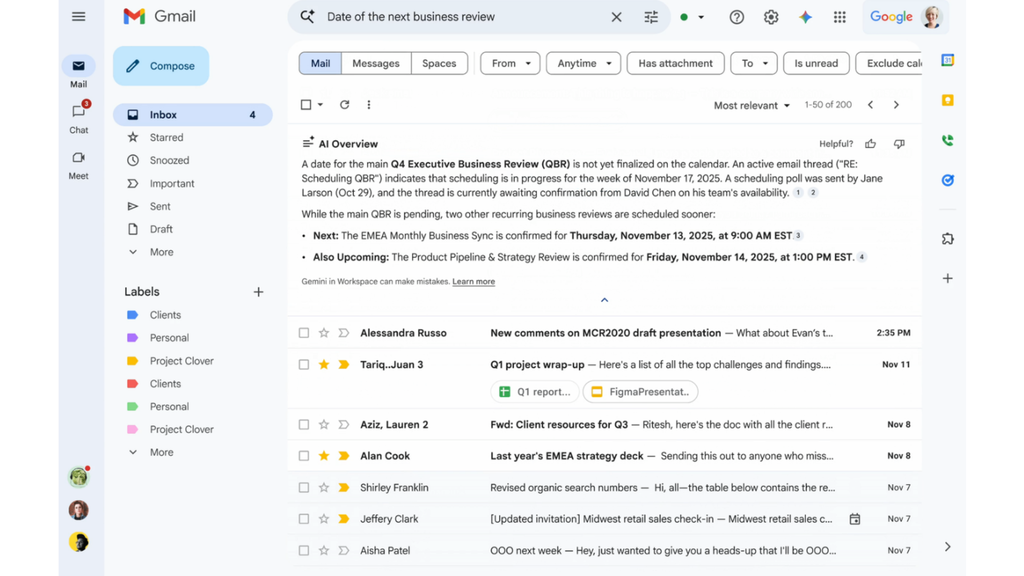 Os resumos são similares aos feitos na busca do Google e podem ajudar a encontrar uma informação “perdida” na enxurrada de conversas do Gmail. Os pedidos são feitos em linguagem natural, como “para quando ficou marcada a próxima conferência?”, e a IA pode analisar múltiplas conversas para trazer os resultados.