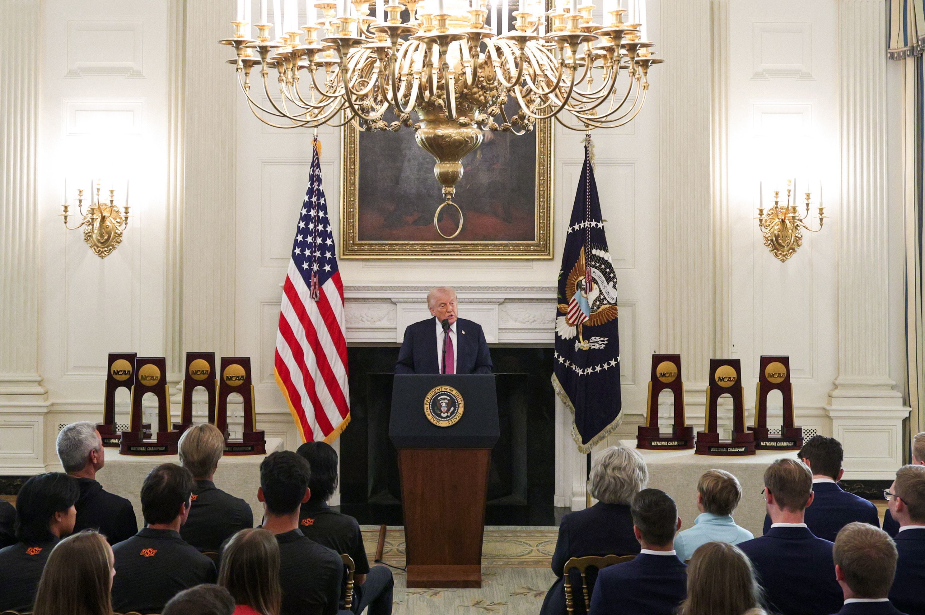 Horas depois, enquanto homenageava atletas universitários no Salão de Jantar de Estado, Trump manteve um silêncio incomum sobre a guerra durante seu discurso, acenando para os repórteres que tentaram fazer perguntas sobre o conflito antes de sair da sala.