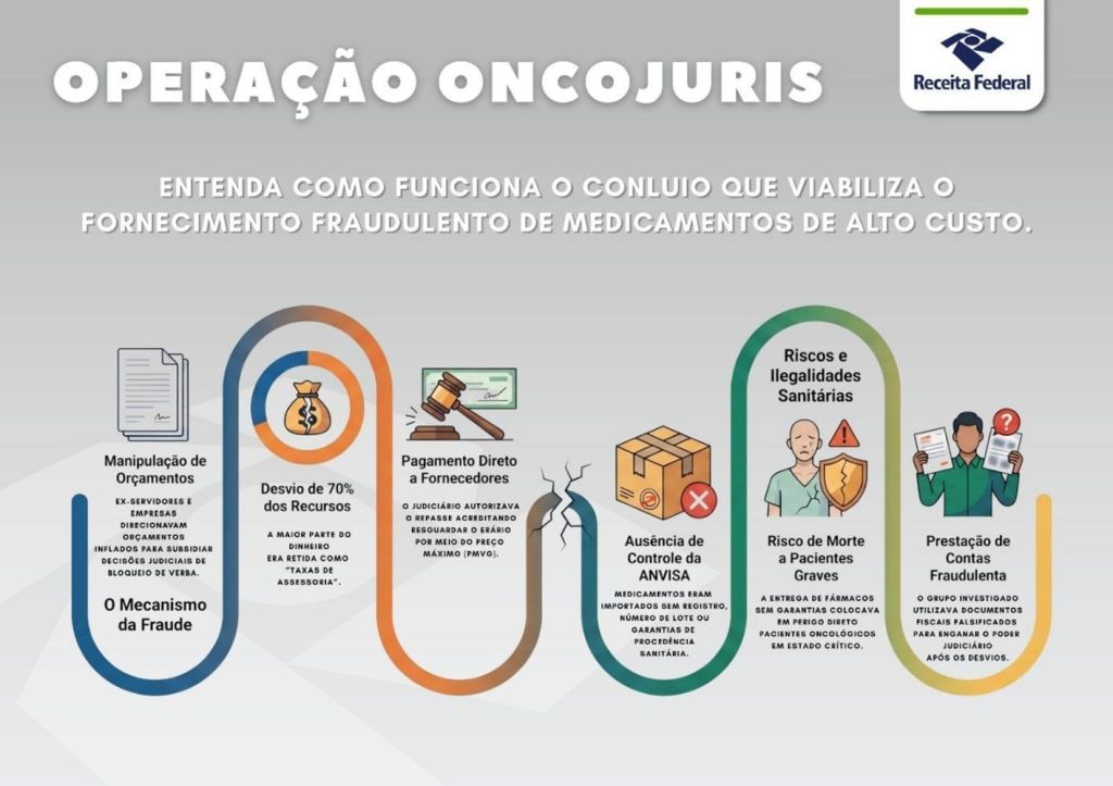 A fase final do esquema também envolveria a entrega de medicamentos sem registro na Anvisa, sem número de lote e sem garantias sanitárias, colocando em risco pacientes oncológicos em estado grave. Também são investigadas possíveis falsificações de documentos fiscais e prestação de contas fraudulenta perante o Poder Judiciário.