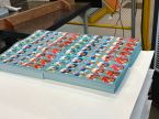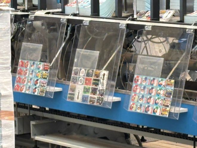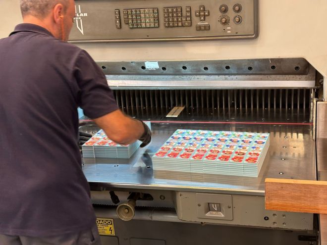 Os cromos são separados e colocados em máquinas que fazem o embaralhamento para evitar repetições num mesmo pacotinho.