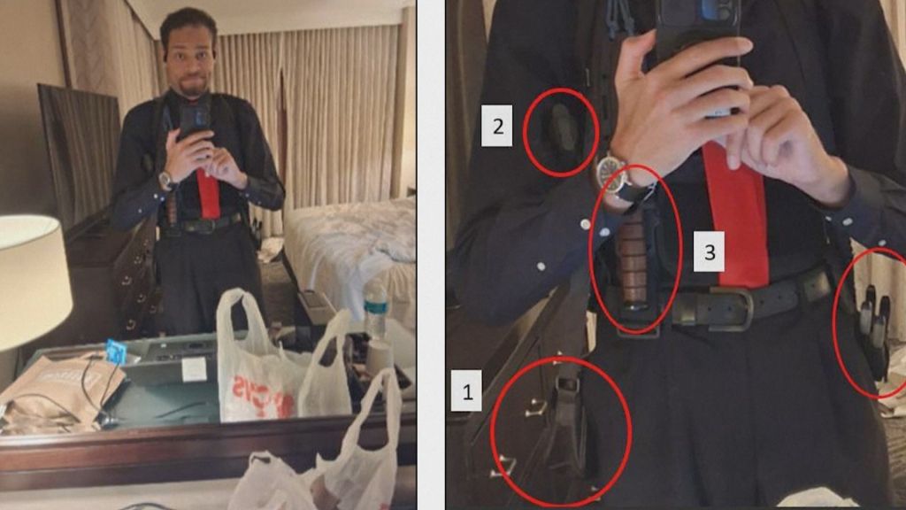Por volta das 21h03 no horário de Brasília, Allen tirou uma foto de si mesmo refletido no espelho de seu quarto de hotel, mostrando armas presas ao seu corpo, de acordo com o registro judicial.