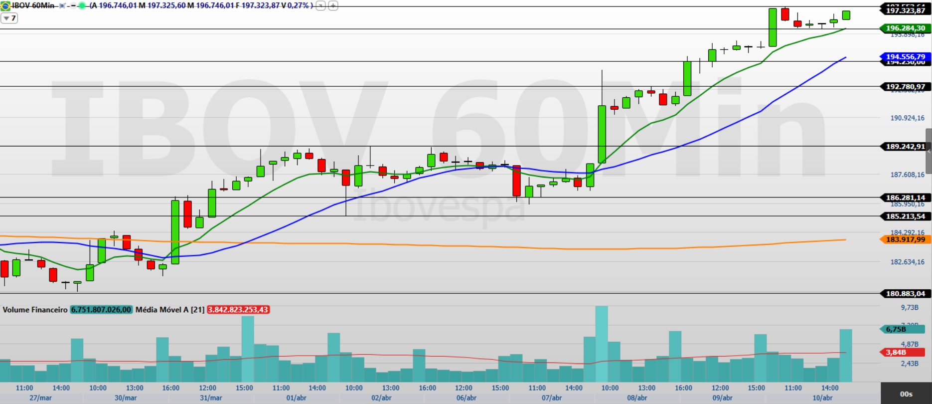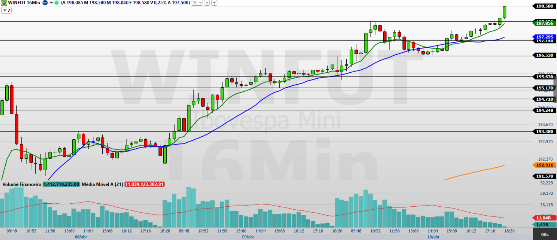 Os contratos de mini-índice (WINJ26), com vencimento em abril, encerraram a última sessão (10/04) com valorização de 1,24%, aos 198.580 pontos, marcando a quinta alta consecutiva.