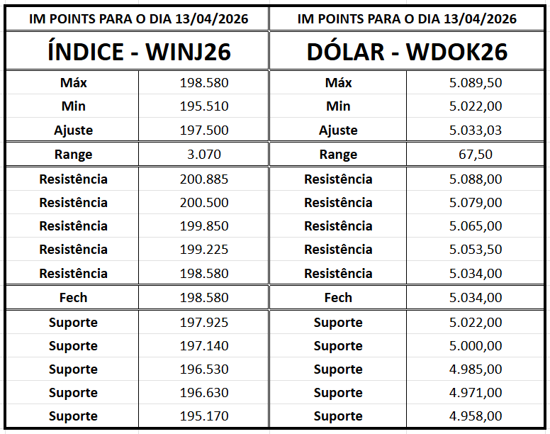 O minidólar (WDOK26) encerrou a última sessão (10/04) em queda de 0,84%, aos 5.034 pontos, ampliando a sequência negativa e mantendo a pressão vendedora no curto prazo.