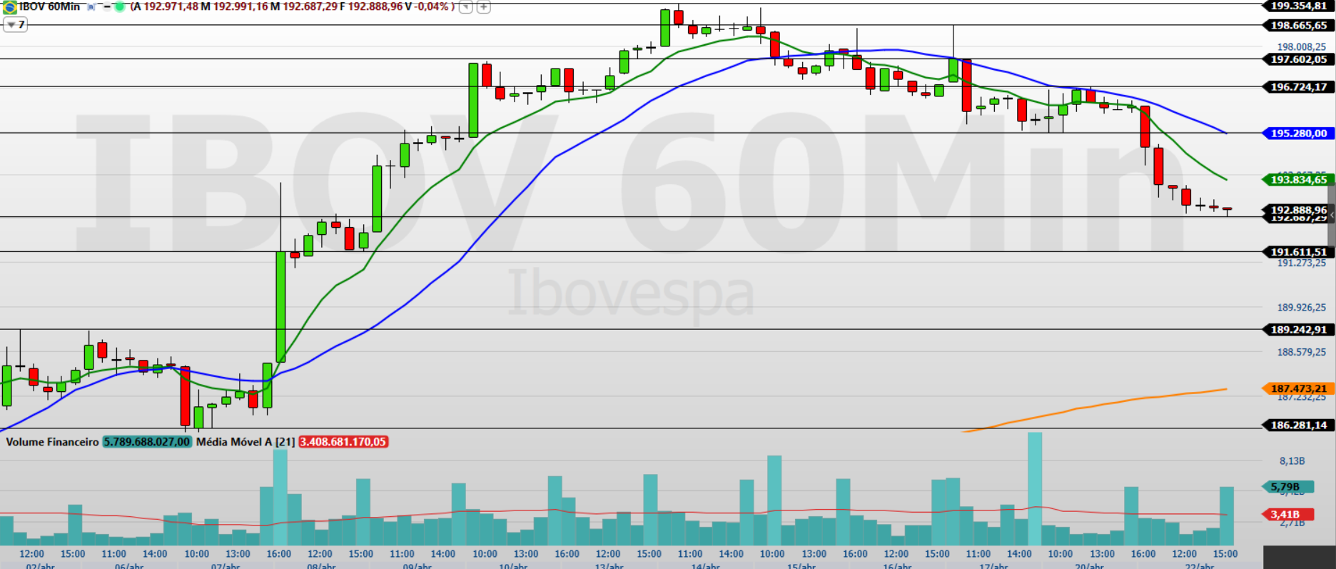 Na minha leitura, o Ibovespa sofreu uma forte pressão vendedora e encerrou a última sessão com queda de 1,65%, aos 192.888 pontos, após oscilar entre a mínima de 192.687 pontos e a máxima de 196.132 pontos. O movimento amplia o fluxo corretivo iniciado após o índice renovar sua máxima histórica em 199.354 pontos na última semana.
