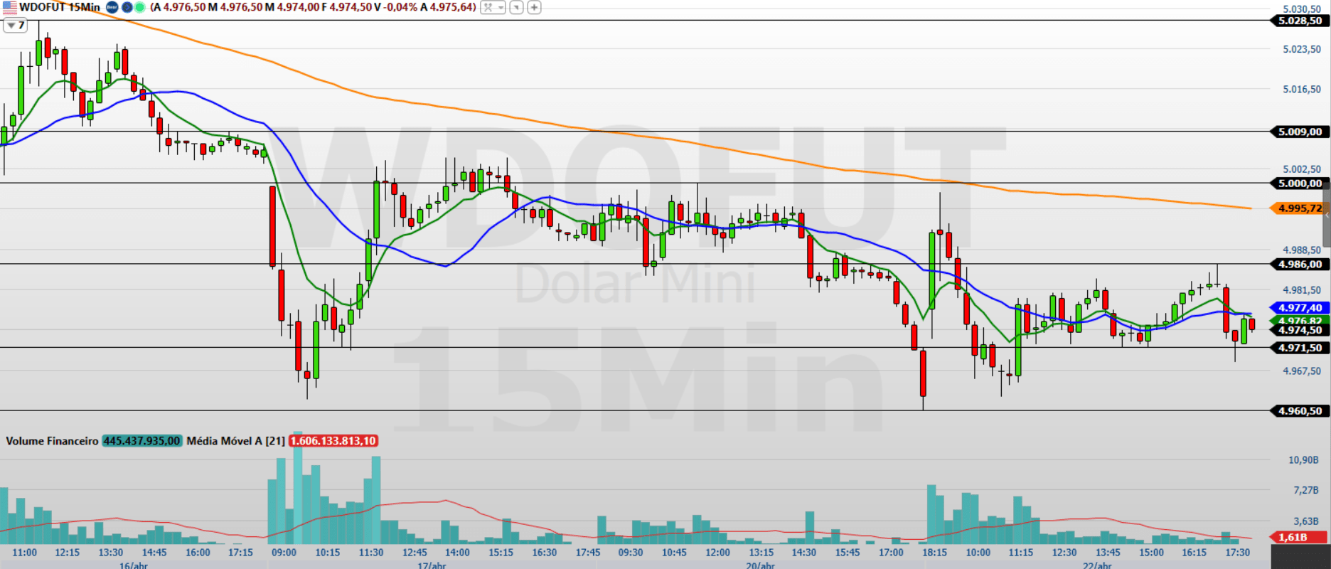 O minidólar (WDOK26) encerrou a última sessão (22/04) em alta de 0,23%, aos 4.974,5 pontos, sinalizando um repique técnico após sequência de quedas.