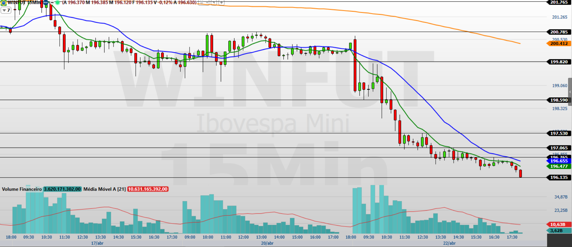 Os contratos de mini-índice (WINM26) encerraram a última sessão (22/04) com forte queda de 2,11%, aos 196.135 pontos, em um movimento que reforça a entrada de fluxo vendedor após a recente tentativa de recuperação.