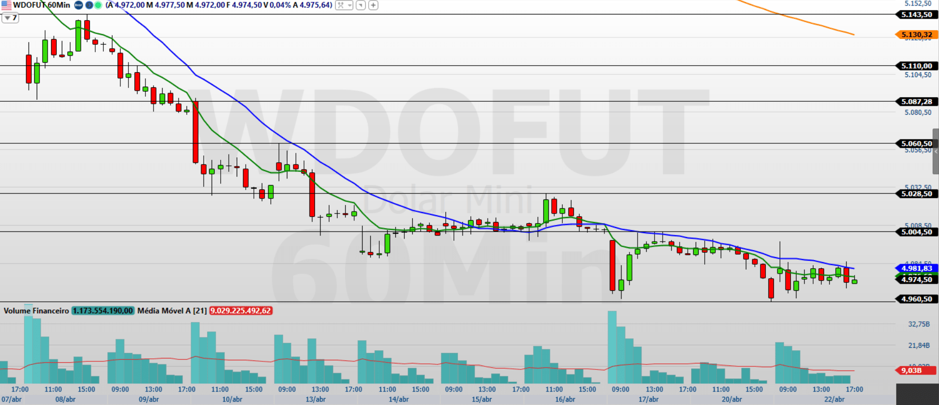 No gráfico de 60 minutos, observo que o minidólar apresentou reação positiva, mas ainda negocia abaixo das médias móveis de 9 e 21 períodos, mantendo o viés técnico fragilizado.